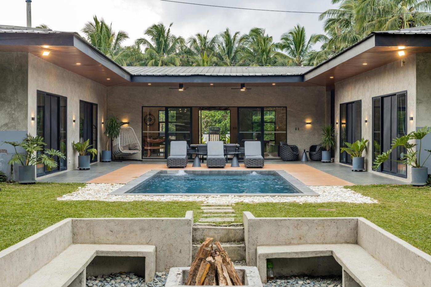 Guests can relax near the outdoor fireplace at the villa.
