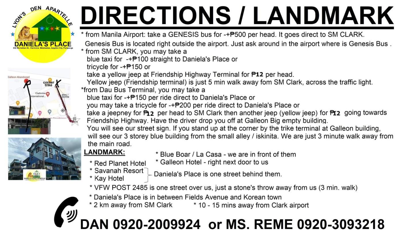 Set in Angeles, 17 km from SandBox - Alviera, Danielas Place offers accommodation with a garden, free private parking, a shared lounge and a terrace. This 2-star hotel offers a bar. The hotel has an indoor pool, a shared kitchen and free WiFi.