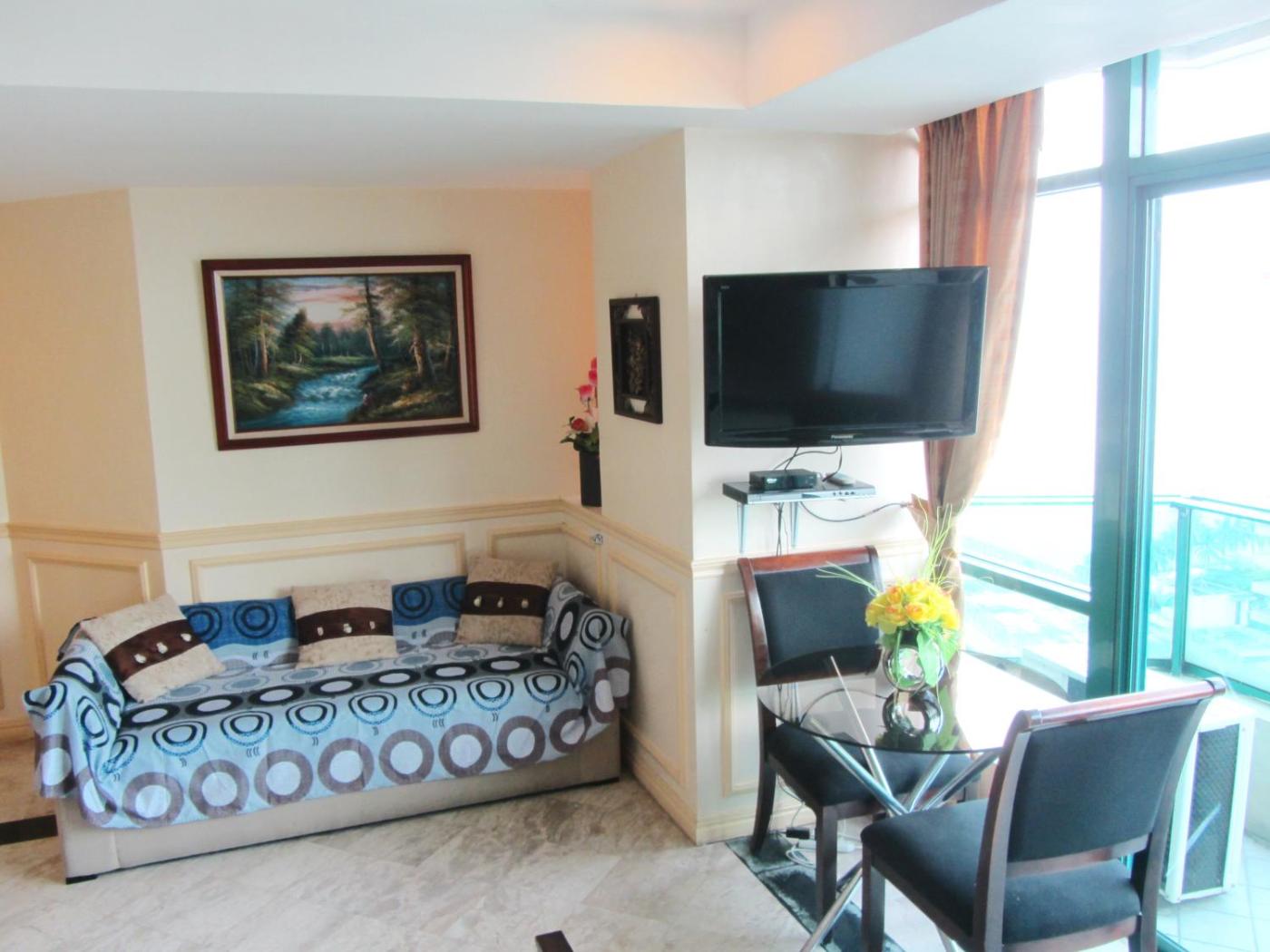 Apartment comes with a seating area, a flat-screen cable TV with DVD player and a private bathroom. The kitchenette is fully equipped with an oven, microwave, a toaster, rice cooker and coffee machine.units offer panoramic views of Manila Bay from the private balcony.